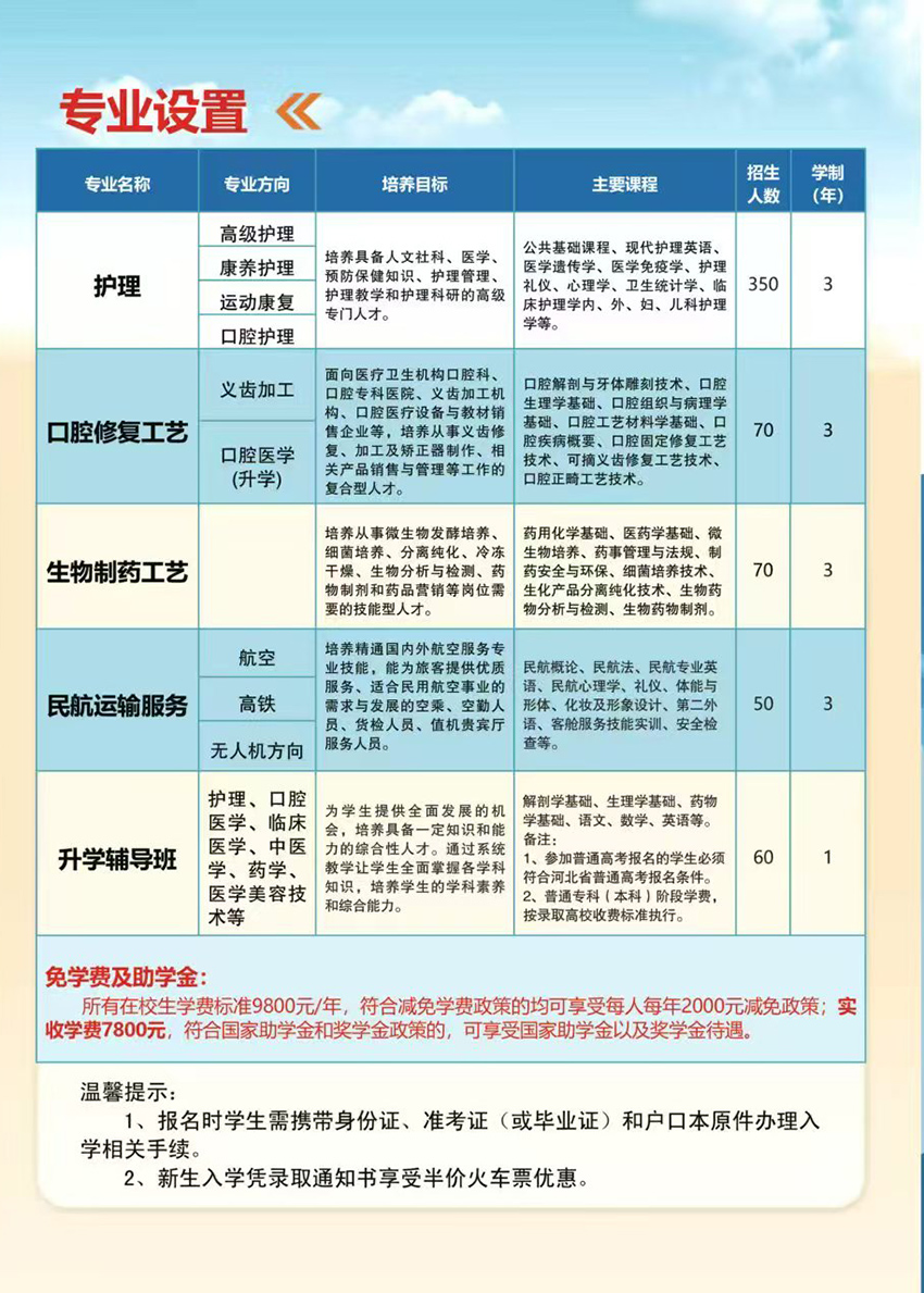 石家庄同济医学中等专业学校2026年春季招生已经正式启动,招生专业:护理,口腔,生物制药,民航运输服务等专业。
