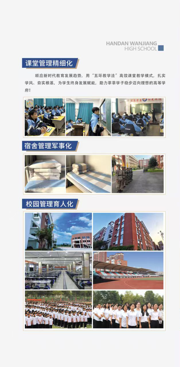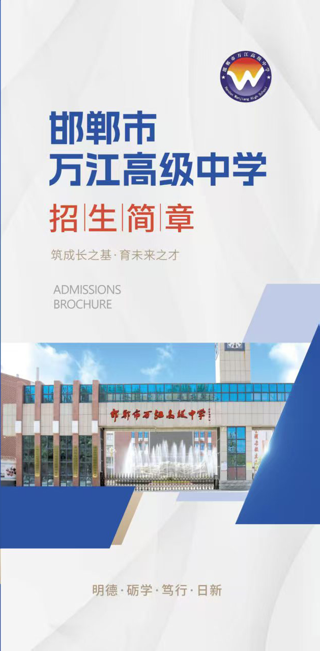 邯郸市万江高级中学坐落于历史悠久、文化底蕴深厚的河北大名,是一所高起点、高标准、高质量的全日制民办高级中学。学校占地面积115亩,校园环境优美,绿树成荫,建筑布局合理,教学区、生活区、运动区规划有序,为学子提供了宁静雅致、宜学宜居的成长空间。